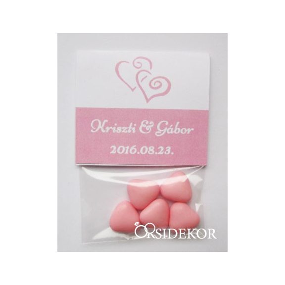 A szív formájú csokikat kis zacskóba csomagoljuk és egyedi címkével látjuk el. A grafika színét igényednek megfelelően választhatod, hogy biztosan harmonizáljon az esküvő színvilágával!