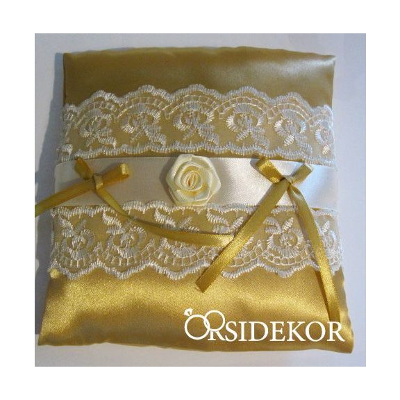 Ez az arany szatén gyűrűpárna csipkével, szalaggal és virággal díszítve igazán egyedi és különleges, maga az elegancia.