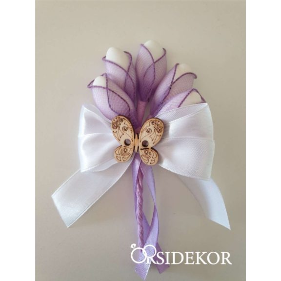 Cukrozott mandula köszönetajándék virág köntösben, szalaggal és fa pillangóval díszítve.