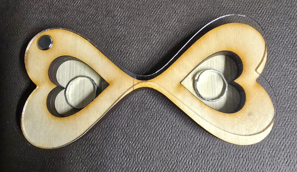 A doboz natúr fa oldalai meleg és természetes megjelenést nyújtanak, miközben a plexi tető átlátszó kivitele lehetővé teszi, hogy a benne elhelyezett gyűrűk és a végtelen motívum egyszerre legyenek láthatóak. A plexi emellett védelmet is nyújt: a gyűrűk portól mentesen és biztonságosan pihenhetnek benne.