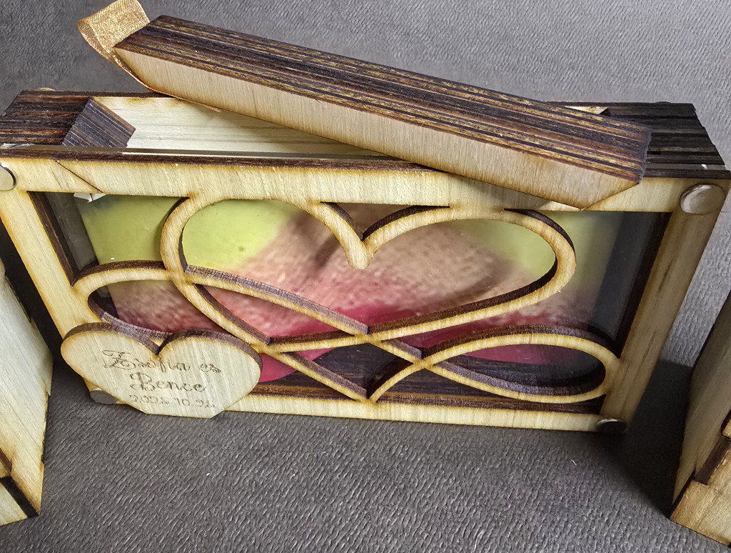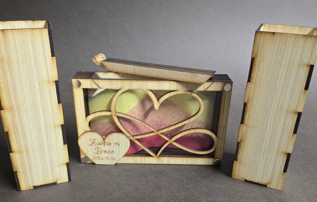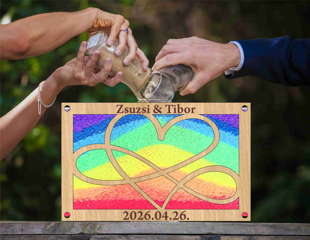 Gravírozott homokceremónia doboz végtelen és szív szimbólummal – örök emlék, amely nem csak az esküvő napján, de egész életetekben jelentős marad. A doboz natúr fa oldalakkal és plexi tetővel készült, hogy a homokceremónia során jól látható legyen, ahogy a homok összeolvad. A gravírozott végtelen jel és szív motívum szimbolizálja az örök szerelmet és az összetartozást.