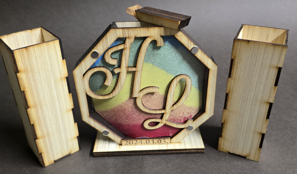 Ez a kifinomult homokceremónia készlet egyedi monogrammal díszítve tökéletes választás az esküvői ceremónia szimbolikus pillanatának megünneplésére. A monogram a párok egyediségét és összetartozását hangsúlyozza, emelve az esküvői homokceremónia különlegességét.