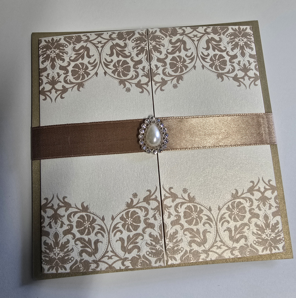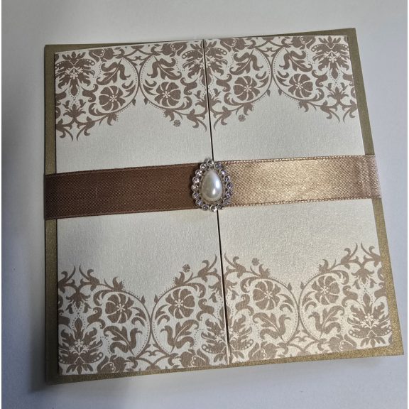 A gyöngy és szalag kombinációja luxus hatást kelt, így a meghívó már önmagában is különleges ajándék a vendégek számára.