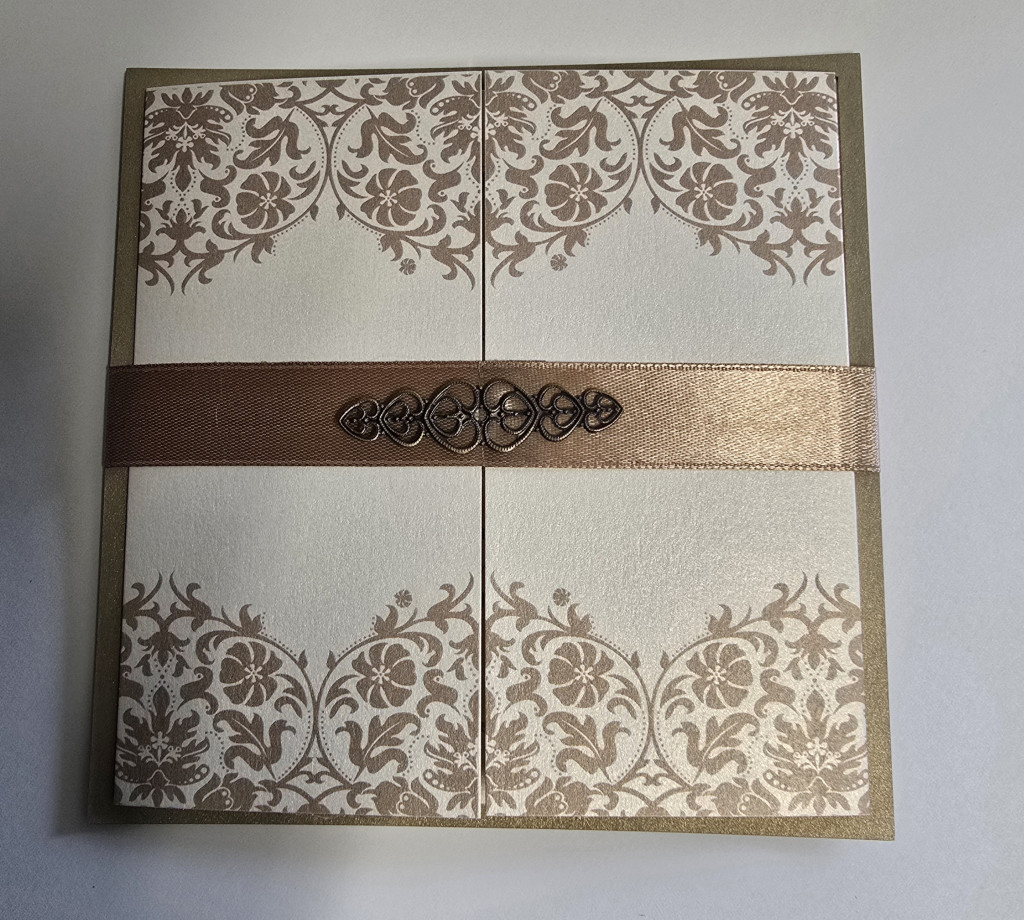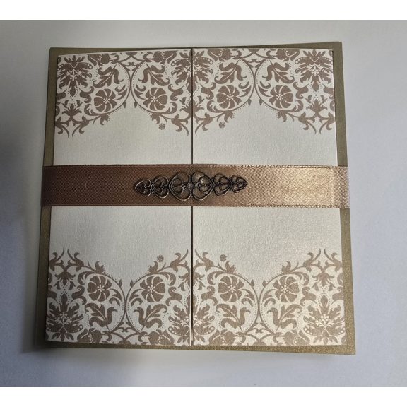 A meghívó alapja egy minőségi papír, amely stabil tartást és elegáns megjelenést biztosít. A meghívót egy dekoratív szalag fogja össze, amelyet egy szív motívumos fém dísz egészít ki.