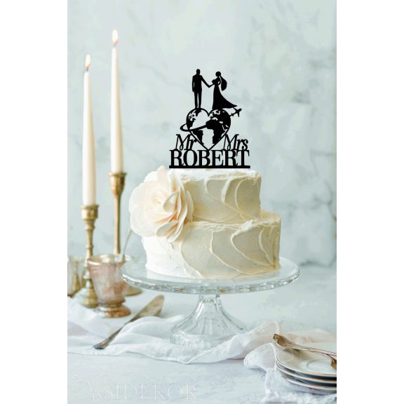 Ez az egyedi, névvel kérhető világutazó tortadísz nemcsak a tortát teszi különlegessé, hanem finoman kiemeli az esküvő témáját és a közös történeteteket is.