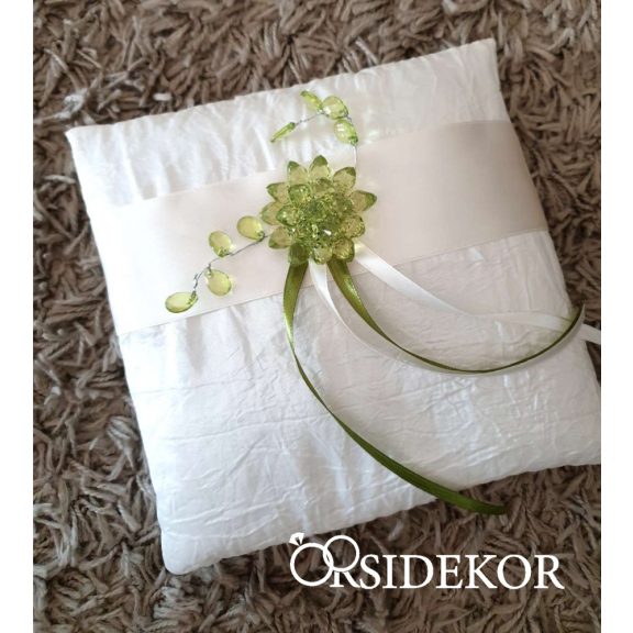 Ez a szatén gyűrűpárna szalaggal és zöld díszekkel dekorálva igazán egyedi és különleges, maga az elegancia.