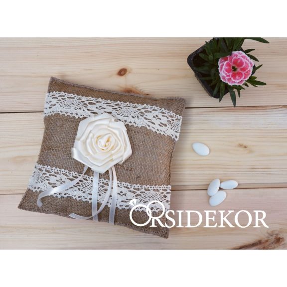 Igazán egyedi dolgot szeretnél? Akkor jó választás ez a romantikus csipkével és szatén virággal díszített juta gyűrűpárna.