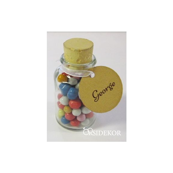 Ennek az üvegcsének a tartalmát tizenkét féle apróság közül választhatjátok ki, de rendelhetitek üresen is, hogy saját magatok töltsétek meg. A mellé kérhető kísérőkártyát az általatok választott felirattal látjuk el, így a köszönetajándékot akár ültetőkártyaként is használhatjátok!