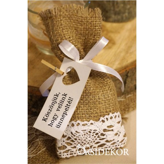 Apró juta zsákocska, visszafogott masnival és fa szívecskével. Bája egyszerűségében és melegésget nyújtó természetességében rejlik.