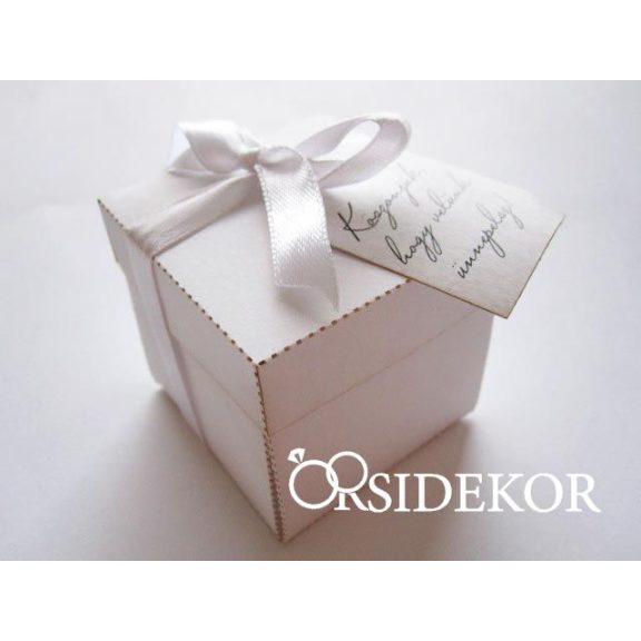 Hagyományos köszönetajándék fehér díszdobozban, fehér szalaggal és ajándékkísérő cédulával díszítve. A dobozkába 3 szem cukrozott mandulát rejtettünk, amelyek az ifjú pár szerencséjét jelképezik, így szimbolikusan a vendégek is osztozhatnak a fiatalokra váró boldogságban.