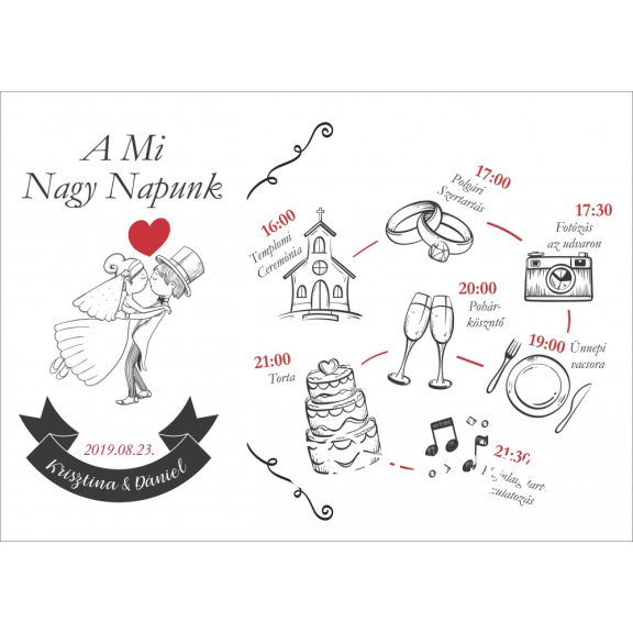 Az Esküvői Programterv praktikus és esztétikus kiegészítője a nagy napnak, amely segít a vendégeknek követni az események sorrendjét. A jól láthatóan kihelyezett programtábla csökkenti a bizonytalanságot, így a násznép tudni fogja, mikor kezdődik a szertartás, a vacsora, a nyitótánc vagy éppen a tortavágás.