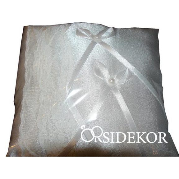 Ez a szatén gyűrűpárna csipkével, szalaggal és gyönggyel díszítve igazán egyedi és különleges, maga az elegancia.