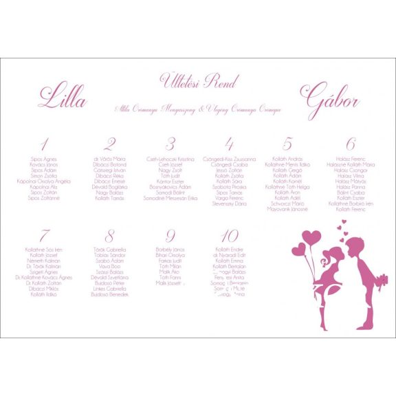 Az ültetési rendet a meghívókkal, menükártyákkal és ültetőkártyákkal egységes stílusban tudjátok megjeleníteni, így az első meghívótól az utolsó köszönőajándékig minden részlet összhangban lesz. A grafika alapját egy kedves, puszilkodó pár illusztrációja adja, amely játékos, mégis modern hangulatot kölcsönöz a dekorációnak.
