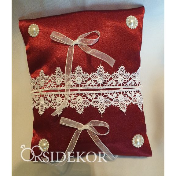 Ez a bordó szatén gyűrűpárna csipkével, szalaggal és gyöngyökkel díszítve igazán egyedi és különleges, maga az elegancia.