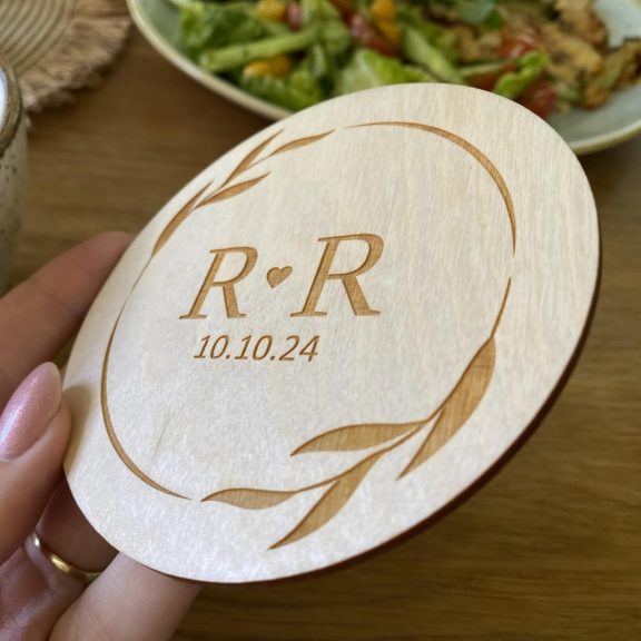 Köszönetajándék fából - Személyre szabott, gravírozott poháralátét esküvőkre