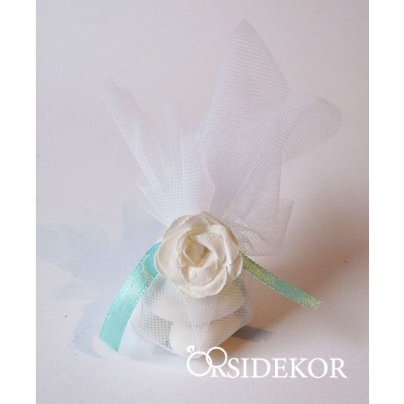 Cukrozott mandula fehér tüllbe csomagolva, kis virággal díszítve - figyelmesség az esküvői násznép számára.